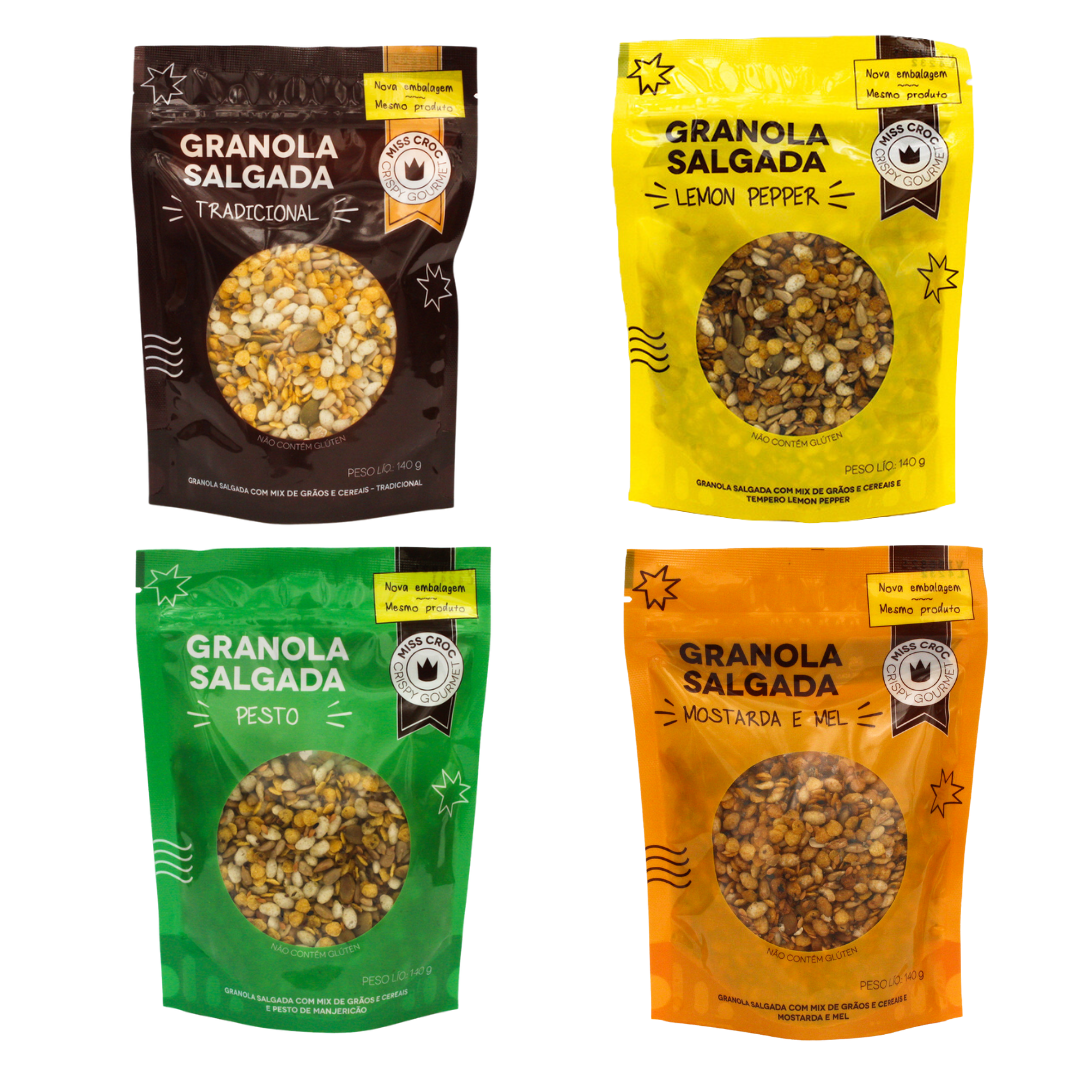 Semente de girassol, flocos de milho, linhaça dourada, semente de abóbora, flocos de arroz, chia em grãos, tempero lemon pepper, gergelim preto e antioxidante tocoferol.