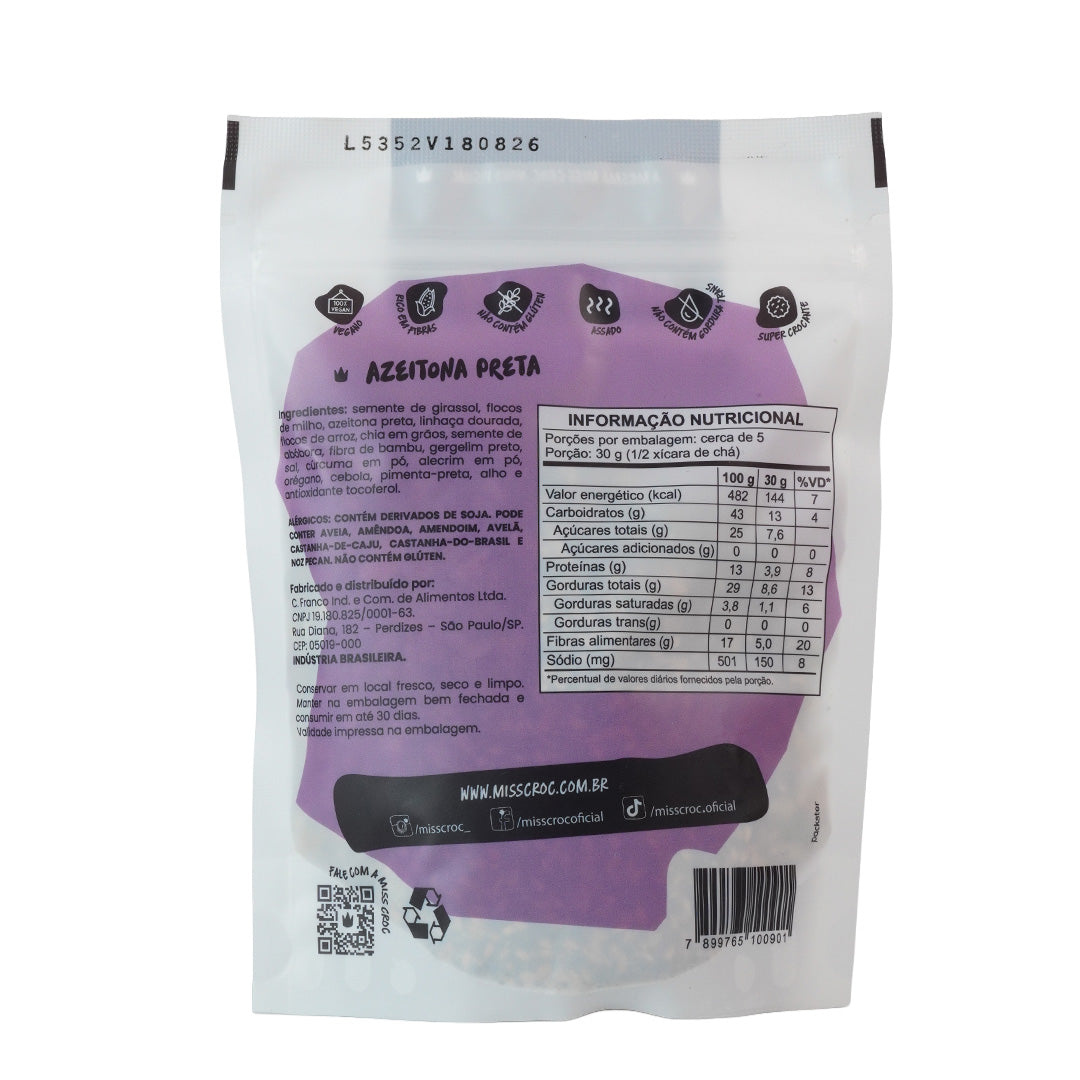 Semente de girassol, flocos de milho, azeitona preta, linhaça dourada, flocos de arroz, chia em grãos, semente de abóbora, gergelim preto, sal marinho, alecrim, orégano, cúrcuma, cebola, pimenta preta, alho e antioxidante tocoferol.